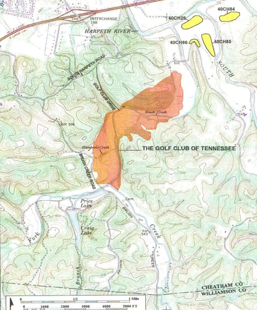 The Golf Club of Tennessee is nestled in the stream valley of Brush Creek, its major tributary Hambone Creek, and several unnamed tributaries. Brush Creek flows north through the course toward the Harpeth River through a fertile valley. Before the land became the property of the Founders of The Club, it served many owners with varied purposes. Several owners left their mark either on the landscape or in the records of the community, while others have faded into obscurity, lost to the historical record. Much of the land was being used to graze horses when it was acquired. The earliest record of the property is found in the Military Warrants granted by the State of North Carolina to veterans of the American Revolution. Three separate warrants grant a total of 947 acres along Brush Creek to three veterans: Hugh Lewis, Jessee Cobb, and Robert Hayes.